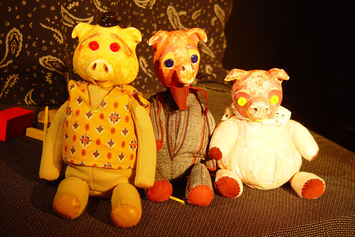 Es waren einmal drei kleine Schweinchen. Die spielten am liebsten Verstecken. Bis eines Tages der Wolf kommt. Er hat Hunger und sucht etwas zu fressen. Und wenn der Wolf an Essen denkt hat er vor allem Schwein im Sinn. Er sucht und sucht und kann kein Schwein finden. Aber er hat alles durcheinandergebracht und die Schweinchen wissen jetzt Bescheid. Sie müssen sich schützen. Sie brauchen ein Haus. Jeder baut, wie er kann. Häuser werden durch die Luft gewirbelt und kaputtgemacht und die Scheinchen durchgeschüttelt. Es wird gehustet und gepustet und am Ende geht doch noch alles gut aus. Die Schweinchen feiern ihr stabiles Steinhaus und der Wolf zerplatzt.